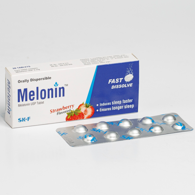 MeloninTM錠:1箱に10錠入りのシート3枚を含みます。各錠剤にはメラトニンUSP 3mgが含まれています。